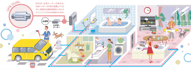 UFB DUAL™は、普段の生活では見えない水道の元栓に設置する事建物内の全ての水道水を特許技術よりウルトラファインバブルにする事が出来ます。